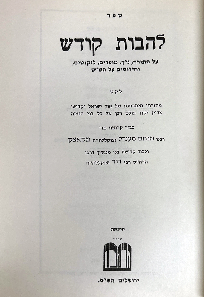 ספר להבות קודש : על התורה, נ”ך, מועדים, ליקוטים וחידושים על הש”ס / לקט מתורתו ואמרותיו של… רבנו מנחם מענדל מקאצק וכבוד… בנו… רבי דוד.