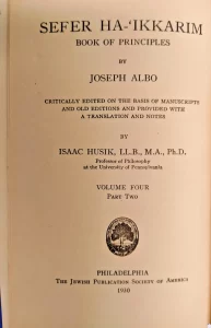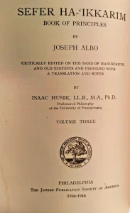 Sefer HaIkkarim (Hebrew: סֵפֶר הָעִקָּרִים‎, romanized: sēp̄er hāʿiqqārim, lit. ’Book of Principles’) is a fifteenth-century work by rabbi Joseph Albo, a student of Hasdai Crescas. It is an eclectic, popular work, whose central task is the exposition of the principles of Judaism. The work contains several internal contradictions. While most scholars see this as indicating Sefer HaIkkarim is an eclectic work, lacking originality and vision, recent scholars instead see this as one of Albo’s methods for conveying esoteric messages